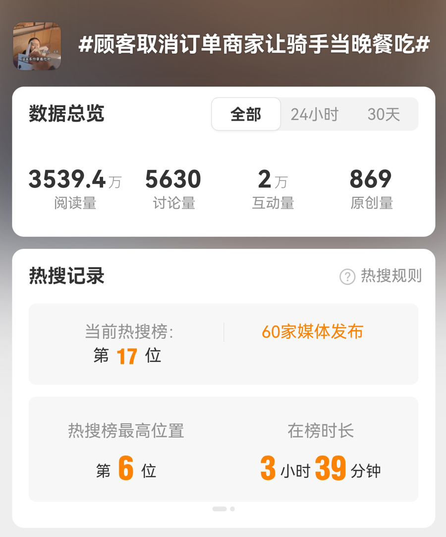 今天,#主顾取消订单商家让骑手当晚餐吃#登上外交平台热搜高位,激勉关注。一份订单的暖心处理,折射出的是对服务者的尊重、对食粮的敬畏、对轨制的优化。
